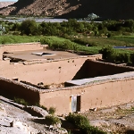 なつめ椰子の茂る谷に下りてみた。住居は四〇~五〇センチもある分厚い日干しレンガの壁に蔽われている。典型的な口の字型コートハウス(中庭)住居である。基本的には大家族制度をとり、中庭を挟んで家畜や作業場、倉庫などが置かれている。