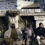 どの水場も個性的で楽しい造りをしていた。そしてどれ一つとして同じ形のものがない。教会広場の一角、崩れかけた石壁の前に置かれた水場は、中央に吐水口を一つだけ持ち素朴な形をしていた。吐水口に手を当てると、程よい冷たさの水が手から腕へと伝わり、旅の疲れを癒してくれるようで心地よい。