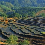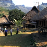ハノイから4~5時間走ったろうか、車はどんどん険しい山岳地をうねるように走る。それまでの長閑な水田の風景は一変し、山間の山腹に沿って築かれた棚田の景観となる。集落は数棟単位で棚田の外れに築かれていた。多くは藁葺きや根の高床式の造り、丸太や竹の柱にヨシズ(細い竹を編んだもの)張りの粗末な造りが多い。山岳地の少数民族集落。彼等紅河上流の棚田を造り主として農業を営んでいる。途中道ばたで民族衣装を纏い、行商をする一向に何度か会っった。黒や赤しろ、紺色、鮮やかなみどりの布、刺繍あり、頭もの、首飾り等多様ないでたちであった。