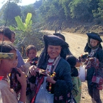 ハノイから4~5時間走ったろうか、車はどんどん険しい山岳地をうねるように走る。それまでの長閑な水田の風景は一変し、山間の山腹に沿って築かれた棚田の景観となる。集落は数棟単位で棚田の外れに築かれていた。多くは藁葺きや根の高床式の造り、丸太や竹の柱にヨシズ(細い竹を編んだもの)張りの粗末な造りが多い。山岳地の少数民族集落。彼等紅河上流の棚田を造り主として農業を営んでいる。途中道ばたで民族衣装を纏い、行商をする一向に何度か会っった。黒や赤しろ、紺色、鮮やかなみどりの布、刺繍あり、頭もの、首飾り等多様ないでたちであった。